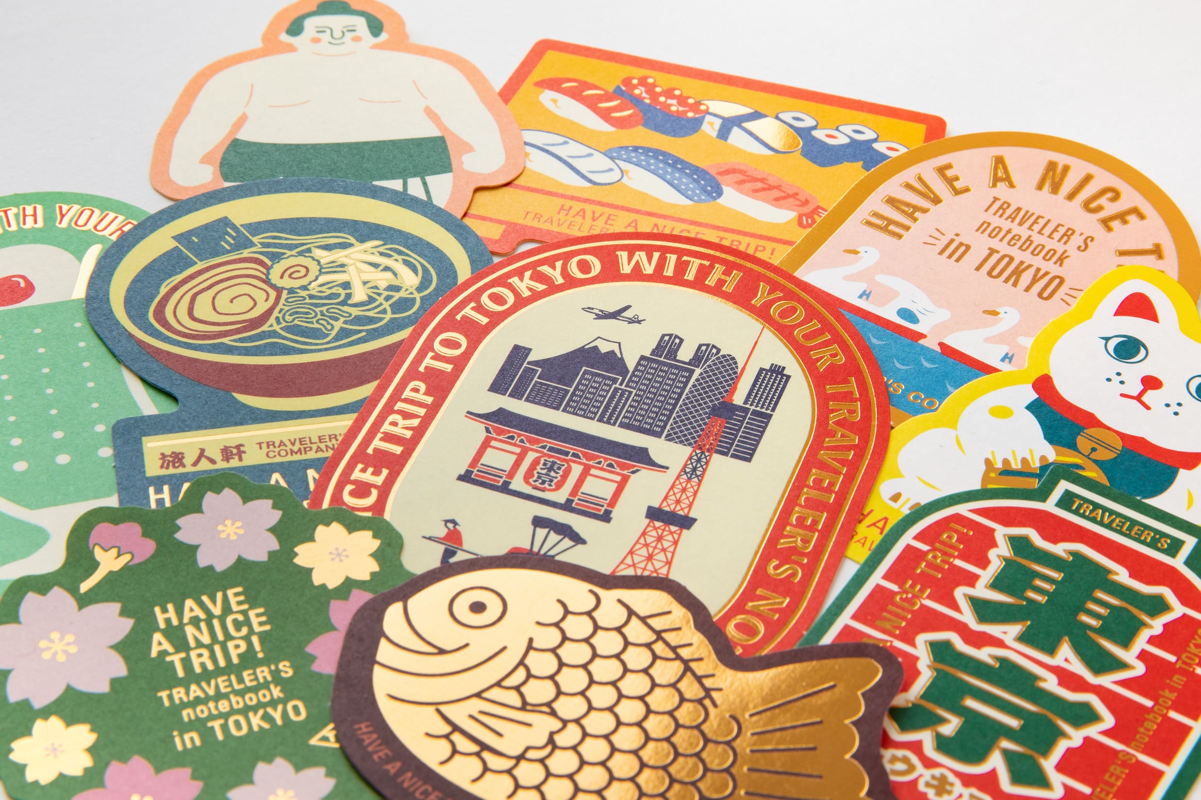 這套貼紙組包含10張採用與東京相關設計的貼紙,包括據說起源於江戶商人文化的招財貓、江戶時期的相撲選手、江戶風格壽司、東京拉麵、奶油蘇打等。這些貼紙不僅可以用來客製化 TRAVELER’S notebook,還可以用於其他在東京旅行時使用的工具!