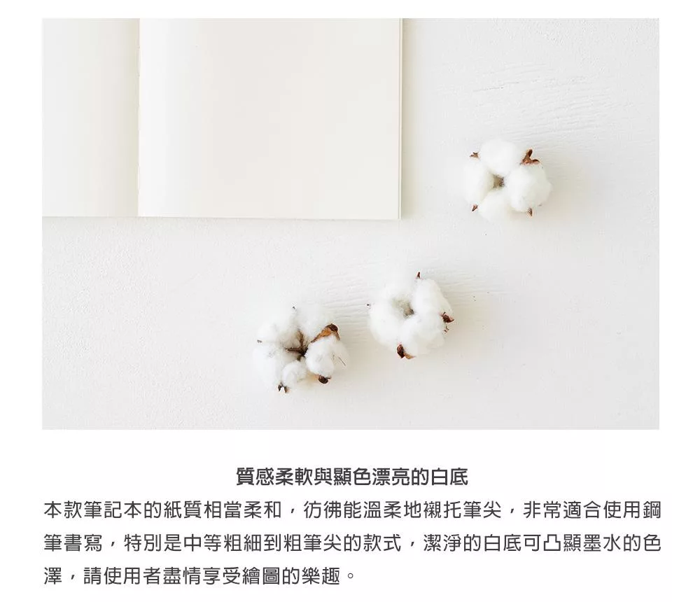 本款筆記本的紙質相當柔和,彷彿能溫柔地襯托筆尖,非常適合使用鋼筆書寫,特別是中等粗細到粗筆尖的款式,潔淨的白底可凸顯墨水的色澤,請使用者盡情享受繪圖的樂趣。