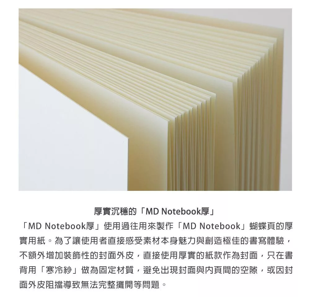 本系列「MD Notebook厚」所使用的紙張,是過往用來製作「MD Notebook」蝴蝶頁的厚實用紙。