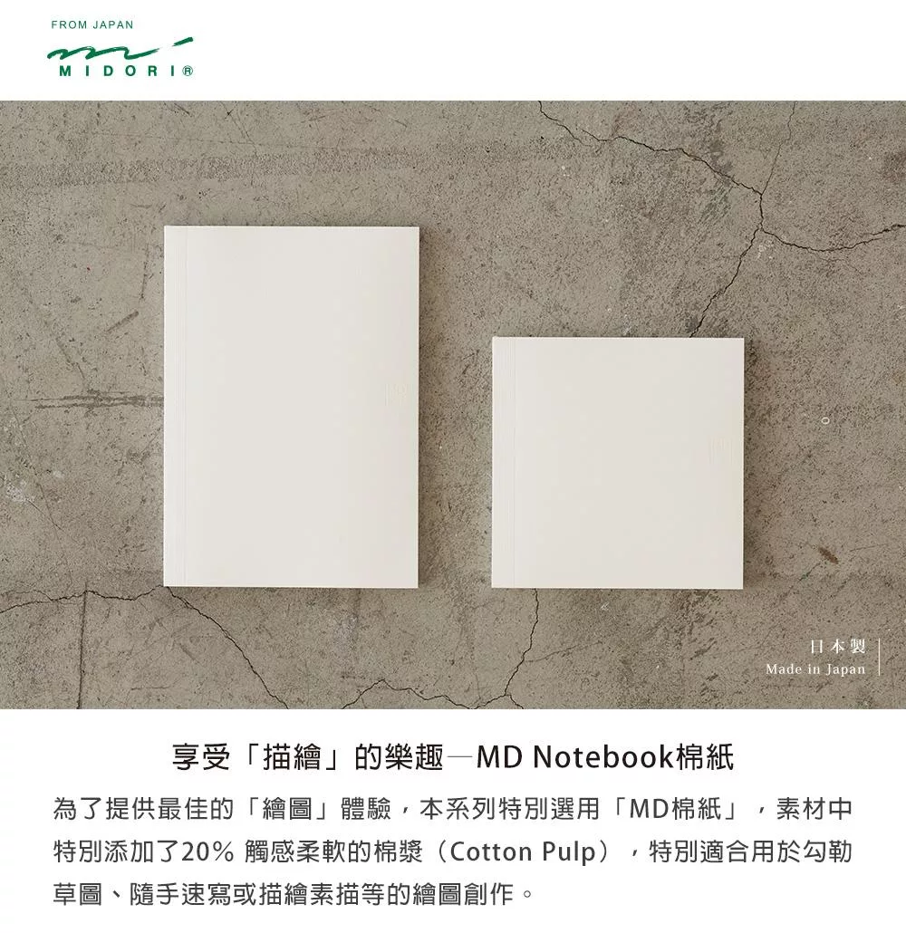 為了提供最佳的「繪圖」體驗,本系列特別選用「MD棉紙」,素材中特別添加了20% 觸感柔軟的棉漿(Cotton Pulp),特別適合用於勾勒草圖、隨手速寫或描繪素描等的繪圖創作。